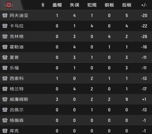 尼克斯隊本場7人得分上雙,其中布倫森砍下26分3次助攻,阿奴諾比24分6板3助,哈特20分6板5助,唐斯14分,外加20籃板3助攻。開拓者隊這邊夏普拿到26分,核心球員阿夫迪亞14投4中,僅得到11分??肆指鰬?zhàn)21分半鐘,只有7分6板的數(shù)據(jù),還出現(xiàn)了3次失誤,正負值負26,本場最低。