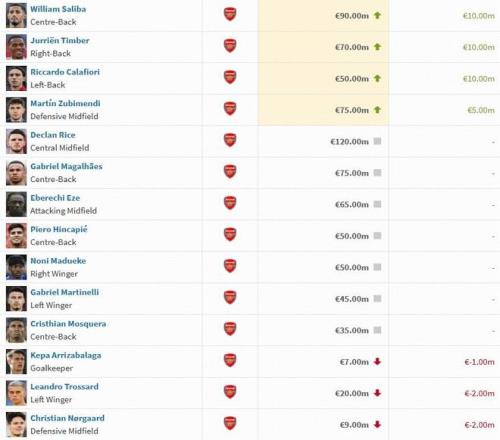 阿森納球員身價(jià)變動(dòng):薩利巴上漲1000萬(wàn)歐,薩卡下跌1000萬(wàn)歐