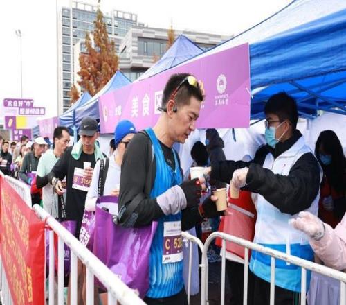 在終點(diǎn)區(qū)域,完賽包、獎(jiǎng)牌、飲料被依次送到跑者手中,一聲聲“辛苦了”“恭喜完賽”的問候,給在嚴(yán)寒中拼搏的跑者送去暖意。