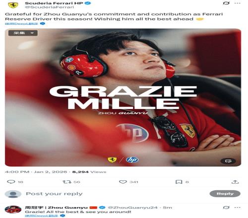 北京時間1月2日下午,法拉利F1車隊在其官方社媒發(fā)文,感謝周冠宇過去一年作為替補車手的付出,祝愿他未來順利。周冠宇在其下留言道:“謝謝!祝一切順利,下次見!”