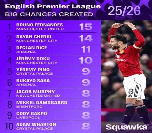 英超23輪過后,布魯諾-費爾南德斯以10次助攻領(lǐng)跑英超助攻榜,據(jù)數(shù)據(jù)機(jī)構(gòu)Squawka統(tǒng)計,這位紅魔隊長也是本賽季英超創(chuàng)造絕佳機(jī)會最多的球員。